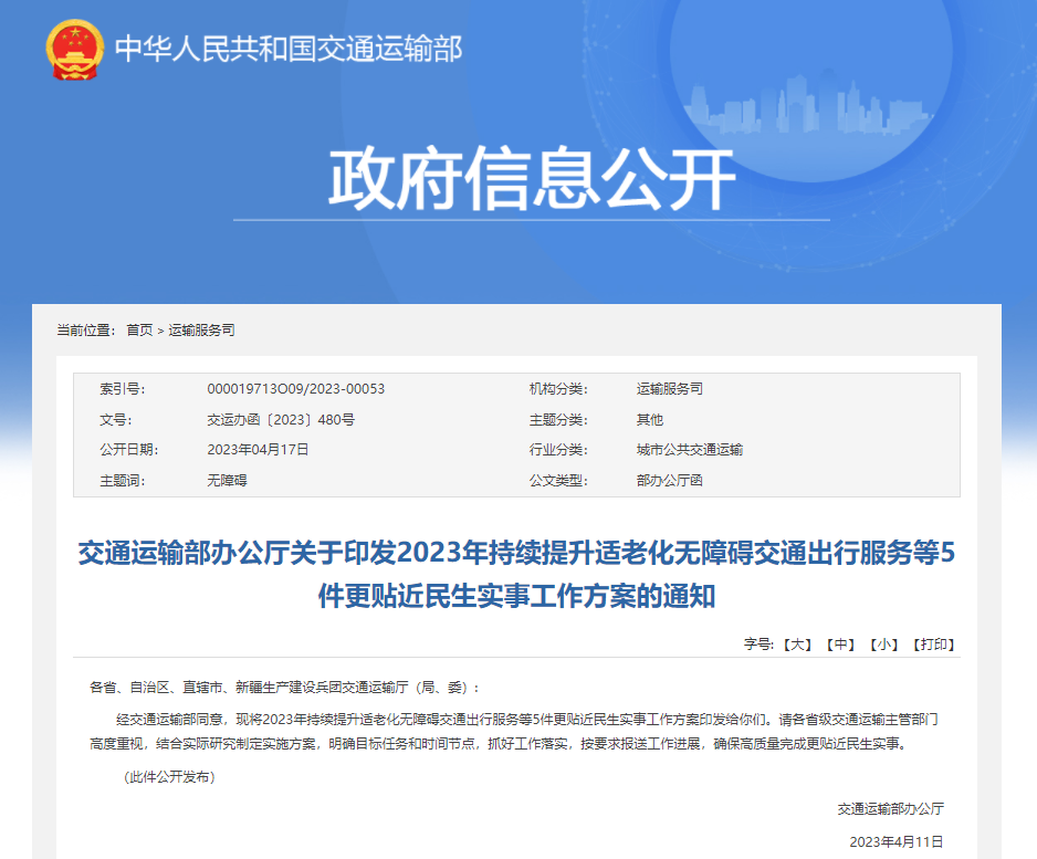 近日,交通运输部办公厅印发2023年持续提升适老化无障碍交通出行服务等5件民生实事工作方案的通知。
