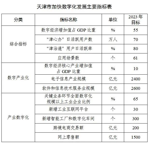 ——数字经济。建成“津产发”数字经济综合应用平台,健全以制造业、商贸业、现代服务业转型升级为重点的数字经济“1+3”政策体系,到2023年数字经济增加值占地区生产总值(GDP)比重不低于55%。重点领域智能制造水平显著提升,以数据为关键要素的新产品、新模式、新业态、新场景蓬勃发展,力争成为国内领先的新一代信息技术与制造业深度融合示范区,新兴数字产业和制造业数字化水平位居全国前列,成为国家智能科技产业北方基地,抢占世界智能科技产业制高点。