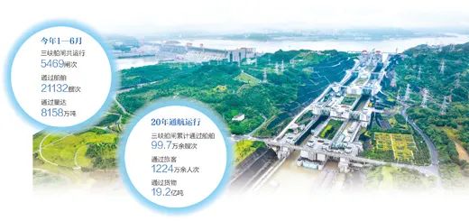 7月1日,长江三峡通航管理局(以下简称“三峡局”)发布数据:今年1—6月,三峡船闸共运行5469闸次,通过船舶21132艘次,通过量达8158万吨,同比增长9.96%,创历史新高。自2003年6月至此,三峡船闸通航20年来,累计通过船舶99.7万余艘次、旅客1224万余人次、货物19.2亿吨。