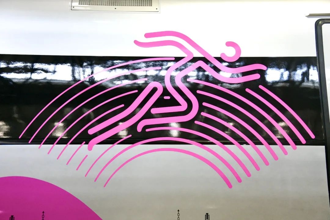 亚运智能动车组以“润泽江南”为外观和内饰主题,“身披”第19届杭州亚运会主形象色“虹韵紫”,在端门、玻璃隔断、行李架等处,亚运会会徽、口号等共同组成列车的特色装饰。此外,更将体育运动图案与钱塘江江潮奔涌的江南元素相结合,让大家在出行途中同步感受浓厚的亚运会氛围和诗画江南的独特魅力。亚运智能动车组“虹韵紫”外观采用的渐变涂装技术,在阳光照耀和山水映衬下,高速疾驰的列车流变万千,气韵十足。