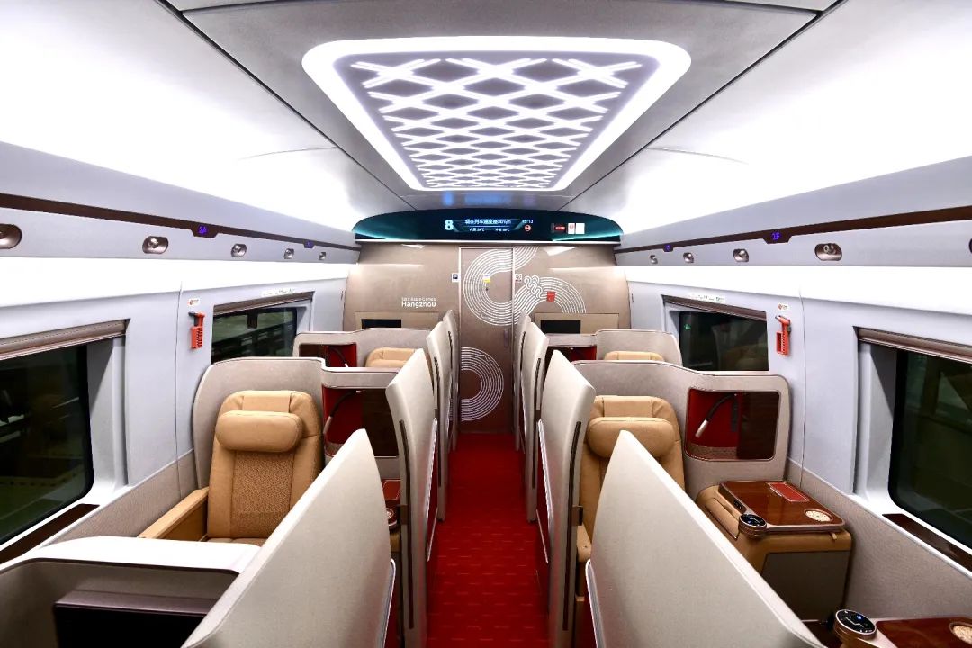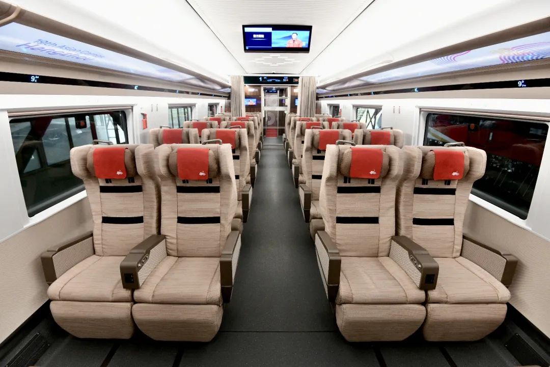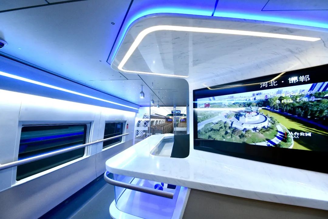部分车厢座椅基于人体工程学进行了调整优化,让旅客乘坐更加舒适。此外,车厢内实现了5G+WiFi网络的全覆盖,个别车厢内部还设有智能交互终端,可以提供高铁娱乐中心、无线投屏、运行信息等服务,满足了旅客在出行旅途中看电影、听音乐等娱乐需求。