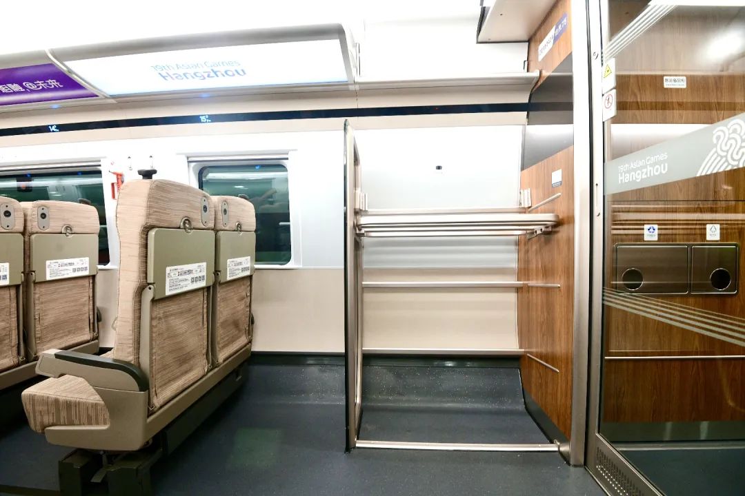 特别值得一提的是,走进亚运会智能动车组的无障碍车厢,设置的900mm宽通过门、残疾人卫生间、轮椅放置区等区域轮椅可以便捷通过,同时在通过台、客室区域、无障碍卫生间内部区域等设置盲文标识,具有特殊旅客引导、车内布置、功能按钮、座位号等提示功能,可为杭州亚残运会运动员和特殊旅客乘车提供方便。