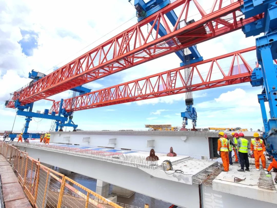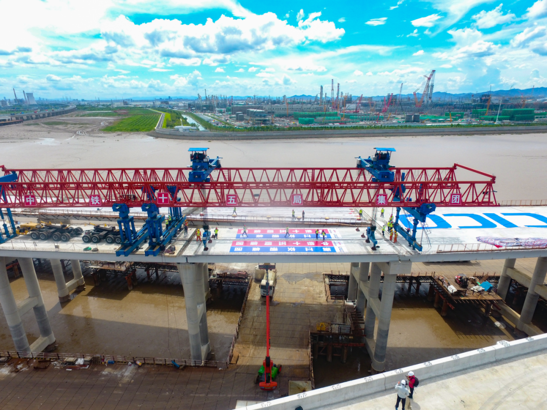 为确保钢混叠合梁制作质量,他们选择在舟山长虹钢结构厂加工。为降低安全风险、缩短运距、加快运架梁进度,他们在海上建成1座卸梁站、2座提梁站、安装2台架桥机,打造运、架梁“一站式”施工。为确保架梁作业安全,他们现场安装无线智能风速预警系统,当海上风速超过7级,严禁吊装作业。同时,增加现场专职安全管理人员,每天对履带吊、龙门吊、架桥机等进行检查,及时排除安全隐患。为加快施工进度,他们坚持“春节施工不打烊”,积极开展劳动竞赛活动,每天以3~5片的速度推进,3次安全上跨金塘大桥,4次成功“牵手”金塘大桥,并圆满完成架梁任务。