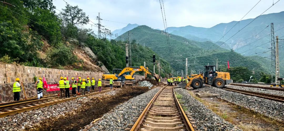 经过48小时连续作战,中铁北京局共投入挖掘机、装载机、发电机等大型施工机械20余台、抢险物资铁镐1000把、编织袋10万条,处理塌方、沉陷、落石30余处,8公里长的抢修管段(起点安家庄火车站,终点雁翅火车站)内上行、下行线修复完毕,达到通车条件。8月6日晚21:50分,在抢险救援人员的护送下,一列货运列车率先通过中铁北京局抢险管段,提前1天完成抢险任务。
