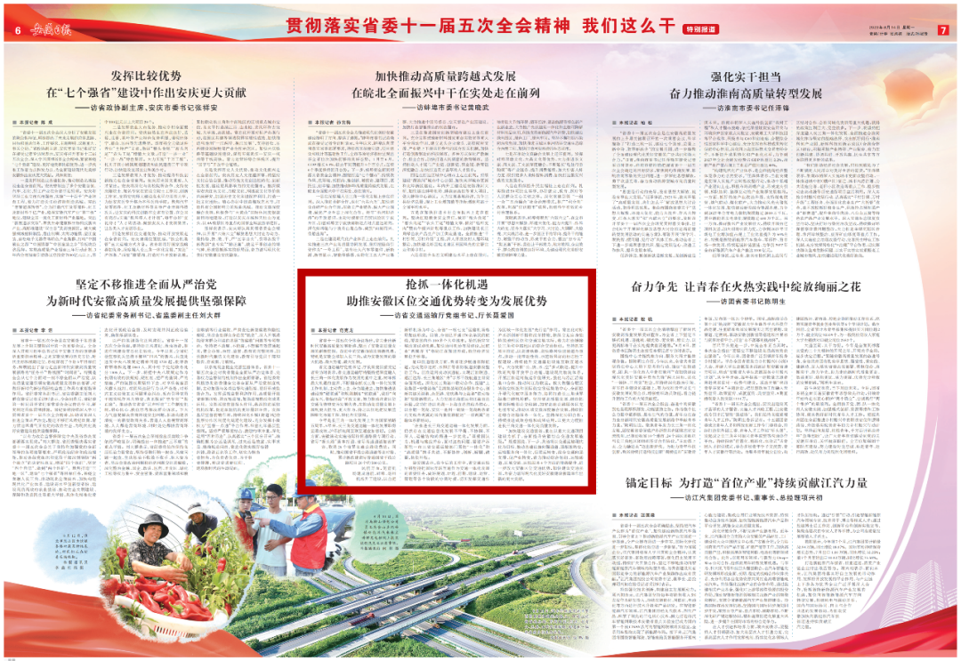 “加快建设交通强省,重在以重大交通项目建设为抓手,全面提升安徽综合交通发展能级。” 聂爱国说,下一步,我省将以交通运输现代化为目标,推动基础设施向强通道、强枢纽转变,运输服务向一体化、促联运转变,综合交通向强支撑、促产业转变,着力推动综合枢纽、运输通道、区域交通、运输服务4个方面的能级提升,进一步放大安徽区位交通优势,加快建设交通强省,为奋力谱写现代化美好安徽建设新篇章作出新的更大贡献。