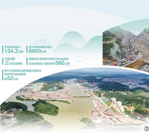 在运河助力下,广西5800多公里内河航道网、云贵部分地区航道将与海洋运输直接贯通,更好发挥西部陆海新通道的结构性功能,大幅提升通道运输能力。西南地区货物经平陆运河出北部湾,较目前经广州出海,缩短入海航程约560公里,预计将为西部陆海新通道沿线地区每年节约运输费用52亿元以上。“目前北部湾港开通集装箱航线75条,航线实现东盟国家全覆盖。”广西北港西江港口有限公司董事长顾荏朝介绍,平陆运河建成后,该公司下属的23个港口可有效衔接北部湾港,形成连接粤港澳大湾区、直通东盟的便捷物流大通道。