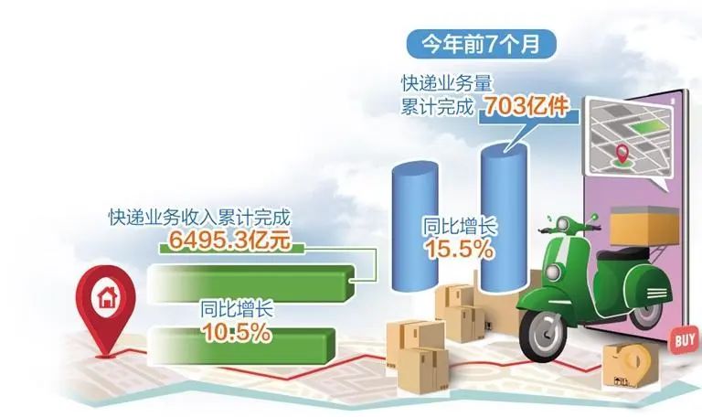 国家邮政局数据显示,今年前7个月,快递业务量累计完成703亿件,同比增长15.5%;快递业务收入累计完成6495.3亿元,同比增长10.5%。各大快递企业陆续发布的二季度业绩报告也显示,随着市场逐渐回暖,快递企业业绩整体向好,行业发展延续良好势头。