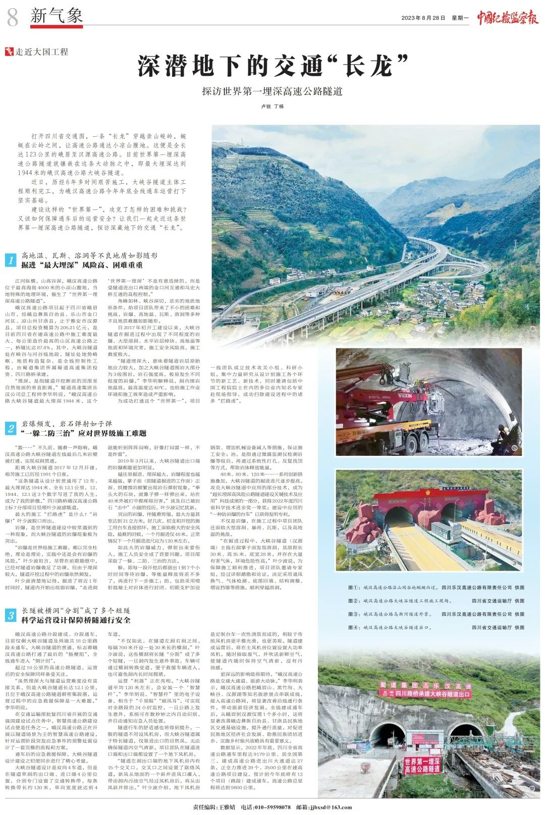 8月28日,中央纪委国家监委网站首页以及《中国纪检监察报》第8版,推出稿件《走近大国工程 | 深潜地下的交通“长龙” 探访世界第一埋深高速公路隧道》,探访四川省正在建设的峨眉至汉源高速公路(简称峨汉高速)大峡谷隧道。