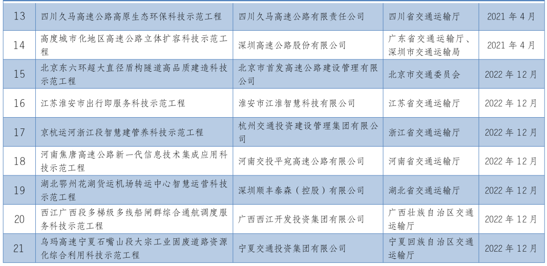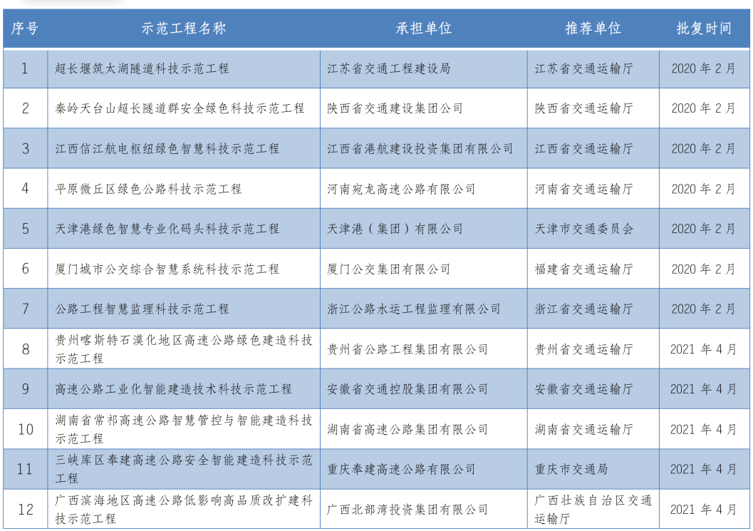 交通运输科技示范工程依托重大工程或重点项目,集中开展关键技术攻关、中试验证和推广应用,是部促进科技创新的重要抓手。2020年以来,交通运输部共批复创建21项交通运输科技示范工程(详见表1),涉及17个省(自治区、直辖市),覆盖综合交通运输各领域,充分体现了安全、智慧、绿色发展理念,为新阶段加快建设交通强国提供了有力支撑。