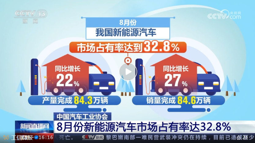 中国汽车工业协会11日公布的最新数据显示,我国汽车工业多项经济指标继续保持增长,其中8月份新能源汽车市场占有率达到32.8%,连续4个月超30%。