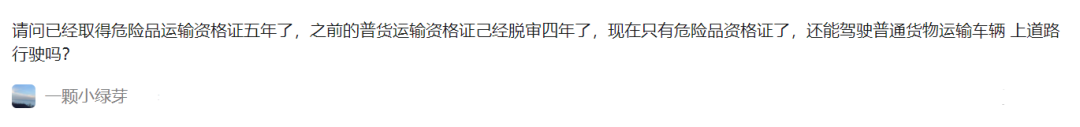 问:请问已经取得危险品运输资格证五年了,之前的普货运输资格证已经脱审四年了,现在只有危险品资格证了,还能驾驶普通货物运输车辆上道路行驶吗?