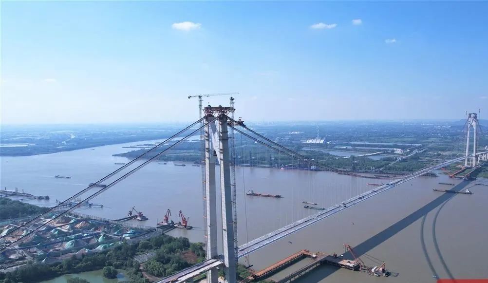 2023年,仙新路过江通道先后完成了主缆架设、乌龙山隧道贯通等重要节点。6月20日,大桥首榀钢箱梁成功吊装,此后的3个月,建设者们克服了台风影响、夏季高温、暴雨恶劣天气、建设条件复杂、长江航道封航压力大及安全防控难度高等困难,并在吊装过程对主缆和钢箱梁线形、桥塔偏位等进行实时监控,对每个吊装阶段进行分析计算,并对后续施工进行预测和指导,以最终达到设计线形。