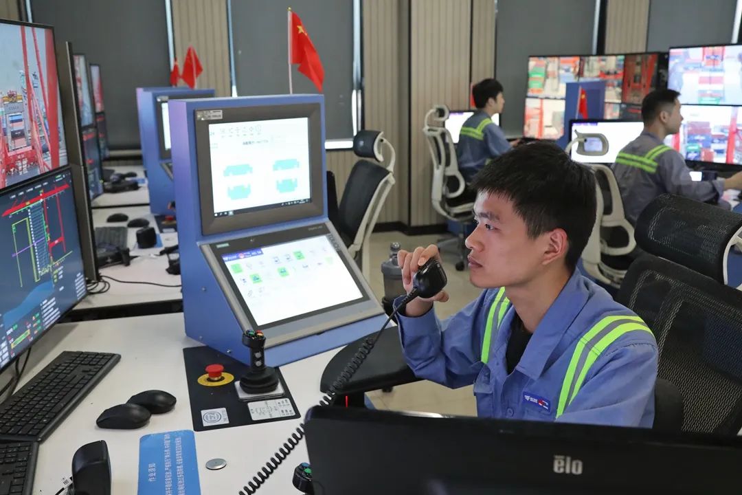 当天下午,同为智慧港口建设示范码头的梅山港区集装箱码头远控桥吊操作室内气氛忙碌,桥吊司机们紧盯着监控屏有序地开展桥吊远控作业,身旁的国旗与屏幕中红色的桥吊相映成辉,装点出节日的喜庆氛围。中秋国庆期间,梅东公司合理调配人员设备资源,及时掌握船舶动态,优化装卸进提管控,以科学统筹和灵活调度保障“双节”期间港区生产作业高效有序。9月29日至10月6日,梅东公司完成集装箱吞吐量19.7万标准箱,为决战四季度凝聚了奋进力量。