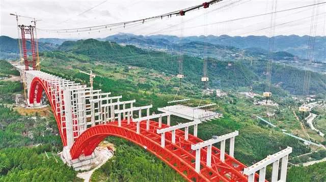 双堡特大桥地处武隆区高山峡谷间,是渝湘复线高速公路关键控制性工程。该桥单幅桥面宽度16米,双向6车道。主桥采用2×405米双跨连续上承式钢管混凝土桁架拱桥,是世界在建跨径最大的双跨连续拱桥。
