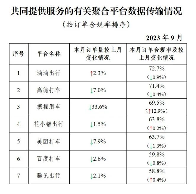其中,面向乘客、与网约车平台公司共同提供服务的平台(俗称“聚合平台”)完成2.15亿单,环比下降5.7%。按订单合规率由高到低的分别是滴滴出行、高德打车、携程用车、花小猪出行、美团打车、百度打车、腾讯出行。