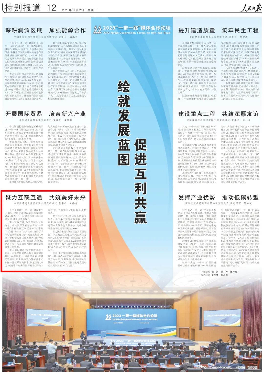 10月25日,《人民日报》2023“一带一路”媒体合作论坛专版,发表中交集团党委书记、董事长王彤宙的署名文章《聚力互联互通 共筑美好未来》。现将文章分享如下:
