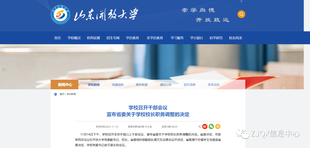 11月14日下午,山东开放大学召开全体中层以上干部会议,宣布中共山东省委关于学校校长职务调整的决定:司家军任山东开放大学党委副书记、校长。