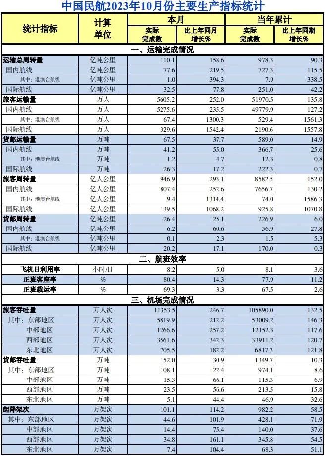 民航局11月20日发布10月份主要生产指标统计显示,今年10月,运输总周转量达到110.1亿吨公里,同比增长158.6%;中国民航旅客运输量达到5605.2万人,同比增长252%;10月货邮运输量为67.5万吨,同比增长37.7%。