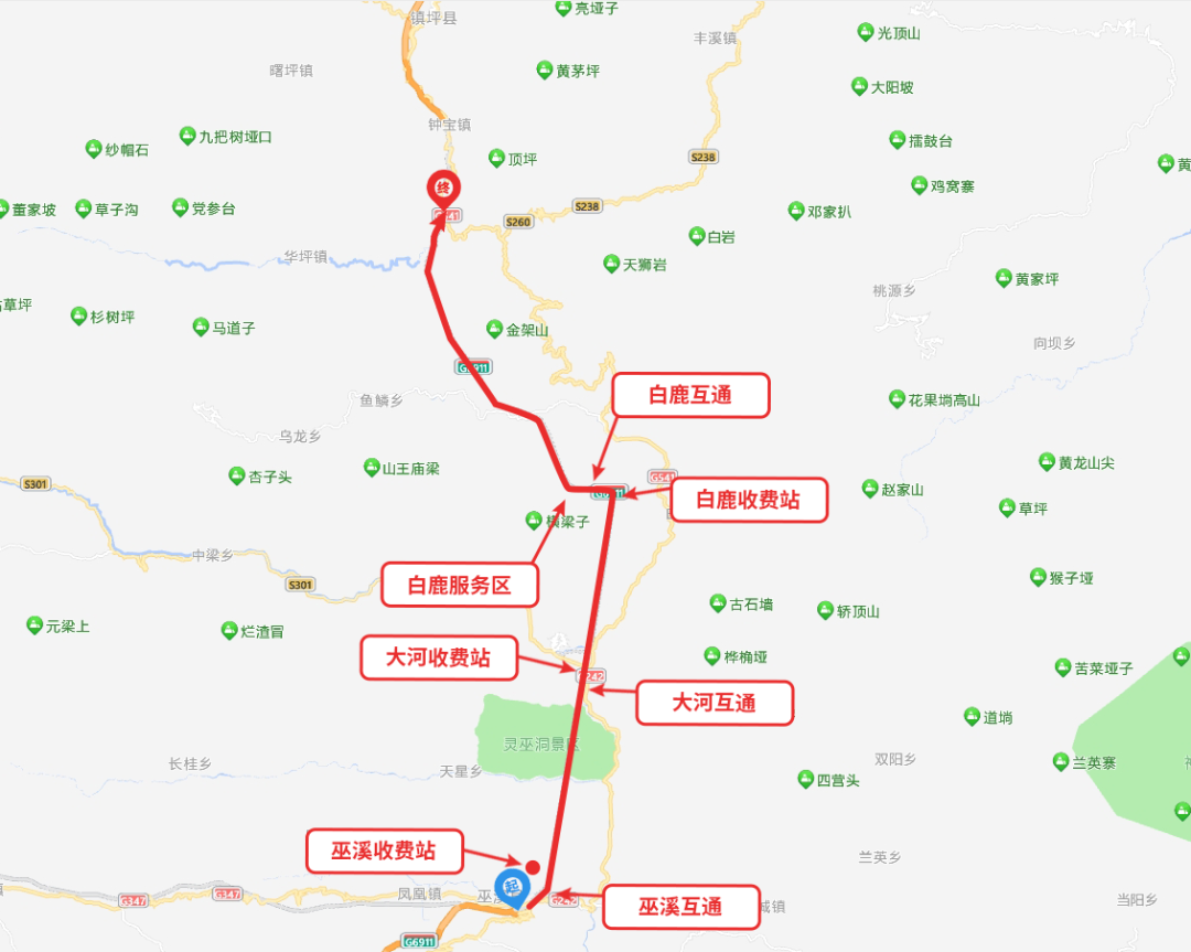 项目起于巫溪县墨斗城,接重庆奉节至巫溪高速公路止点,向北经巫溪县天星乡、宁厂镇、大河乡、白鹿镇、徐家镇、鱼鳞乡,止于鸡心岭隧道渝陕省界,接陕西平利至镇坪高速公路。