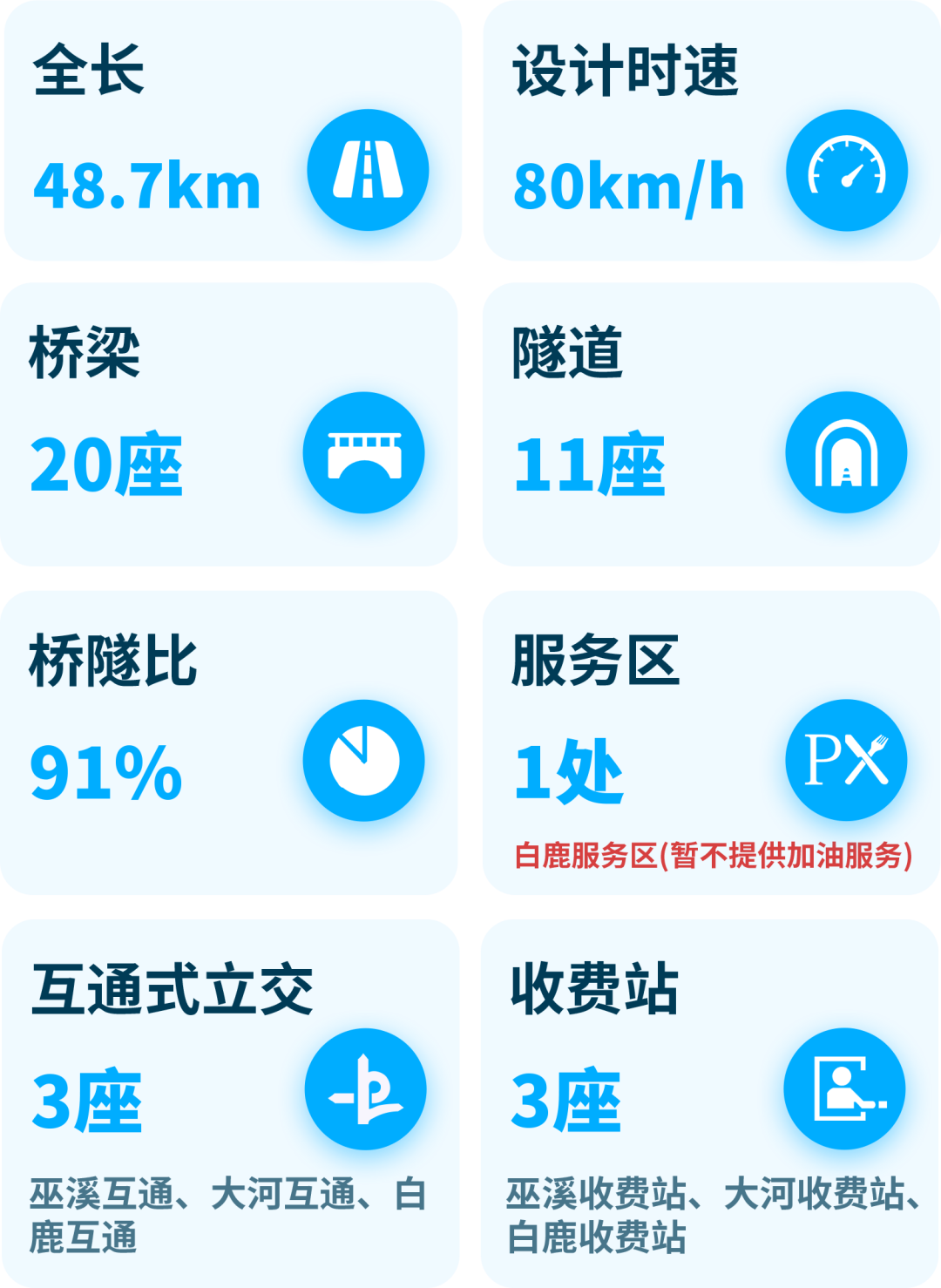 项目全长约48.7公里(其中,重庆境内45.2公里,陕西境内3.5公里),采用双向四车道高速公路标准建设,设计速度80公里/小时。