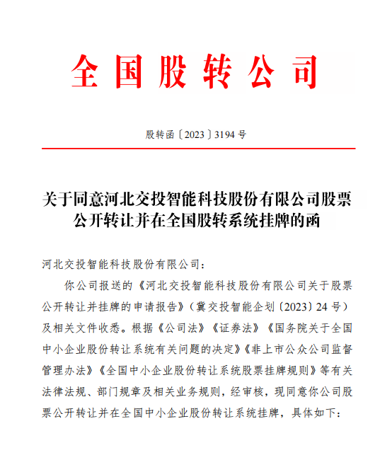 近日,河北交投智能科技股份有限公司(以下简称“公司”)收到全国中小企业股份转让系统发来的《关于同意河北交投智能科技股份有限公司股票公开转让并在全国股转系统挂牌的函》(股转函[2023] 3194号),同意公司股票公开转让并在全国中小企业股份转让系统挂牌,成为河北交通投资集团有限公司(以下简称“河北交投”)旗下第一家进军资本市场的企业。