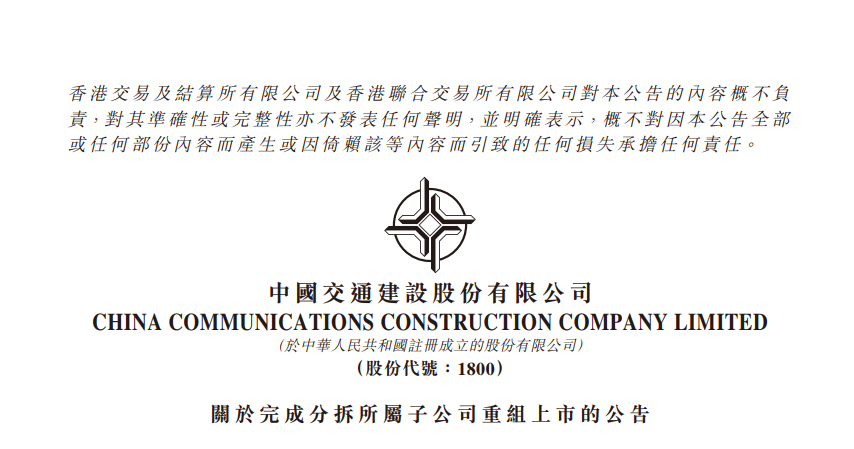 日前,中国交通建设股份有限公司(简称“中国交建”)发布《关于完成分拆所属子公司重组上市的公告》(简称《公告》),披露了公司分拆重组上市取得成功。具体如下: