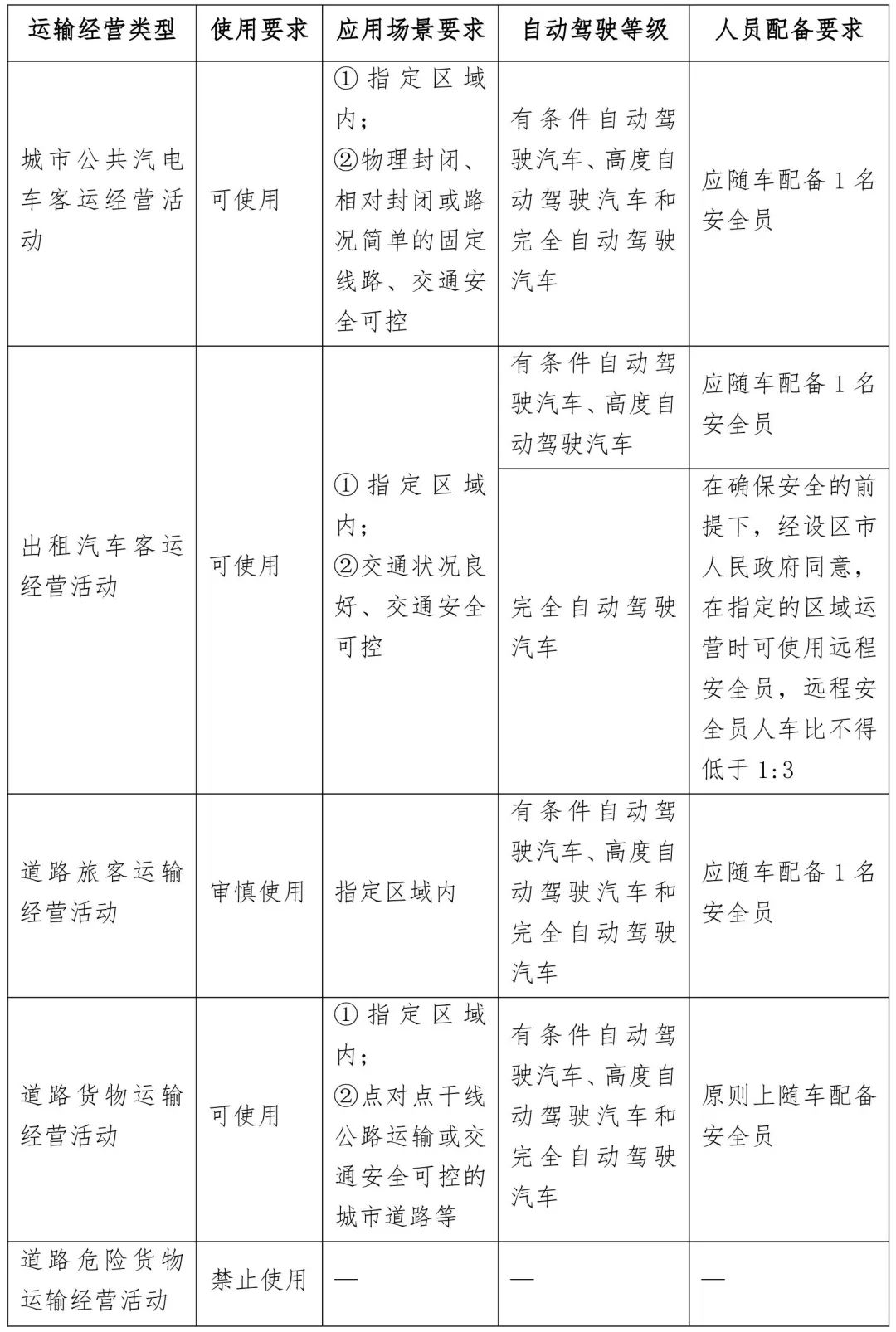 自动驾驶汽车应用于多种运输服务应用场景,不同场景下设计运行条件不同、安全风险存在差异、风险等级要求不一。为进一步保障安全,《指南》分类别、分场景、分等级规范自动驾驶汽车在运输服务领域的应用,明确自动驾驶汽车在不同类型运输经营活动中的适用场景条件和人员配备要求等(见下表),指导各类运输服务经营活动开展自动驾驶应用,切实保障自动驾驶运输服务安全,推动汽车自动驾驶商业化应用健康有序发展。