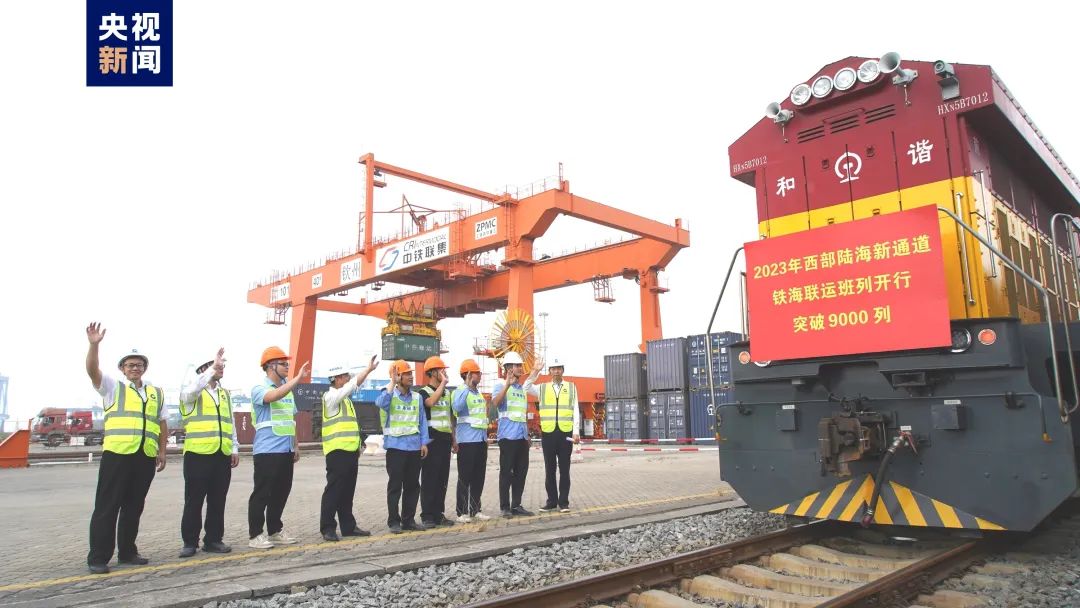 12月12日上午,火车汽笛声响彻钦州港,一列满载印尼起酥油、新加坡面粉、柬埔寨香米等100个集装箱的海铁联运班列,从钦州铁路集装箱中心站缓缓发出驶向重庆团结村站,标志着2023年西部陆海新通道班列开行突破9000列、提前20天完成年度目标。