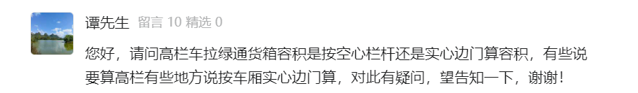 问:您好,请问高栏车拉绿通货箱容积是按空心栏杆还是实心边门算容积,有些说要算高栏有些地方说按车厢实心边门算,对此有疑问,望告知一下,谢谢!