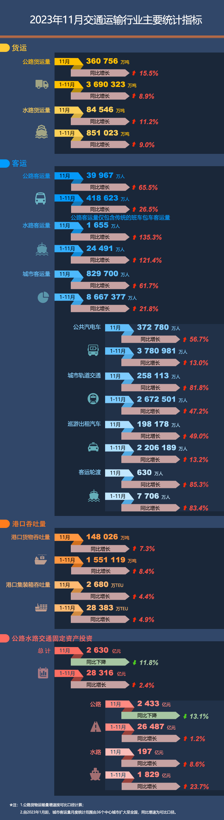 2023年11月交通运输行业主要统计指标