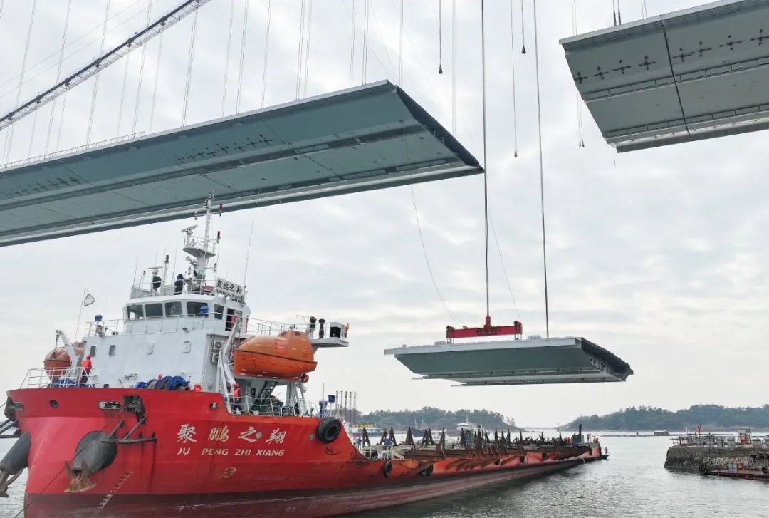 自2021年2月18日龙门大桥主塔桩基施工至今,历时1054天顺利实现合龙。龙门大桥主航道桥共需吊装96节钢箱梁,总重量达19000余吨。项目投入两台整体提升能力为600吨的大型自动化缆载吊机进行钢箱梁吊装作业,其智能化中央自动控制系统可控制整个设备装卸、吊装、行走等全部作业,为钢箱梁海上吊装施工安全提供保障。
