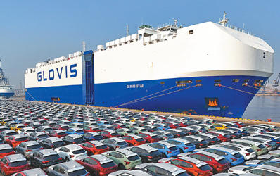 国产汽车在山东港口烟台港集结等待装船出口。唐 克摄(人民视觉)