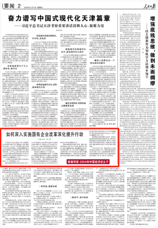 2023年,在巩固深化国企改革三年行动成果的基础上,我国高质量高起点启动实施国有企业改革深化提升行动,取得丰硕成果。今年国有企业改革深化提升行动具体应该怎么干?有哪些重点工作?小新为您推荐《人民日报》2月4日刊发的《如何深入实施国有企业改革深化提升行动(政策问答·2024年中国经济这么干)》。
