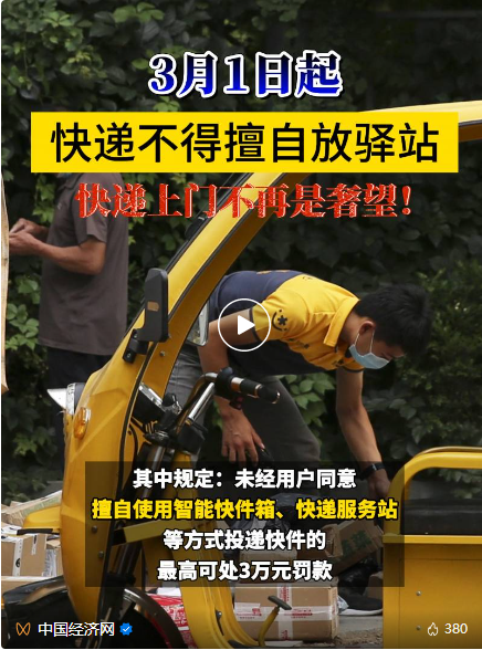 交通运输部:3月1日起快递不得擅自投驿站、快递柜