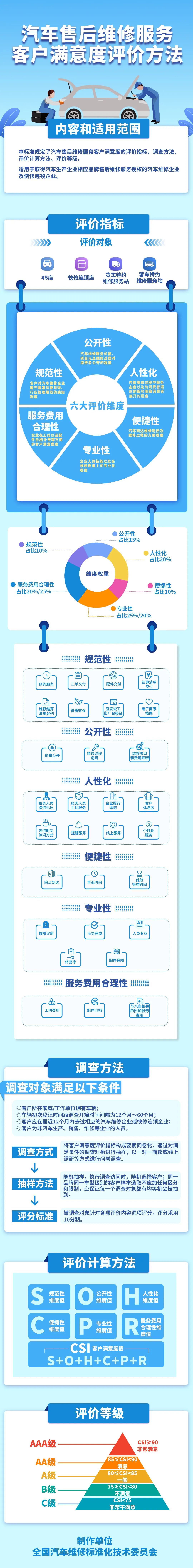 3月1日,交通运输部发布的交通运输行业标准《汽车售后维修服务客户满意度评价方法》(JT/T 900—2023)正式实施。该标准的修订发布,将有效促进我国汽车售后服务客户满意度调查评价工作的规范化、科学化和专业化发展,促进汽车维修行业不断提升售后维修服务质量和服务水平,为我国汽车产业的全面健康和高质量发展提供保障。