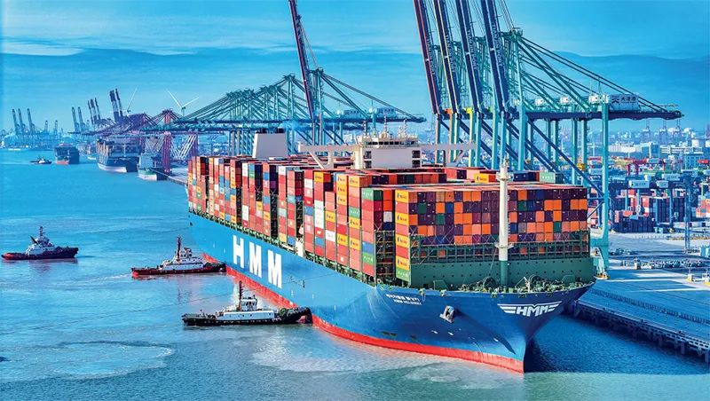 2023年天津港集装箱吞吐量突破2200万标准箱。图为2023年7月13日,现代赫尔辛基轮在天津港全球首个“智慧零碳”码头作业,随后装载着京津冀及内陆腹地的货物前往欧洲多个国家。 天津港集团供图