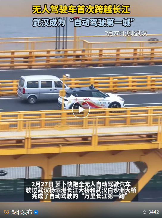 2月27日,全无人自动驾驶汽车在湖北武汉完成了自动驾驶车辆的“万里长江第一跨”。武汉成为全国首个实现智能网联汽车横跨长江贯通示范运营的城市。