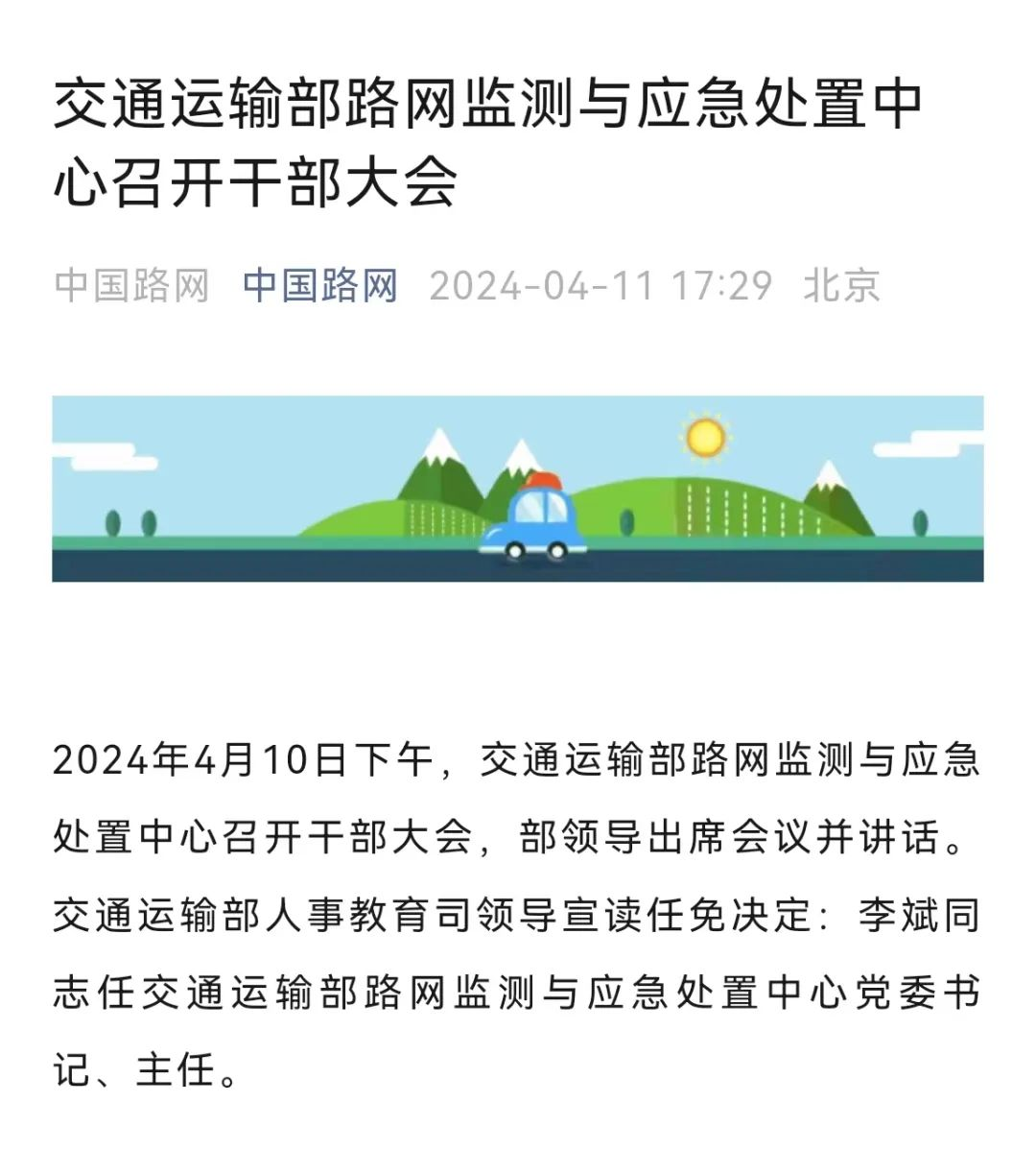 根据“中国路网”微信公众号消息,李斌已任交通运输部路网监测与应急处置中心(简称部路网中心)党委书记、主任。