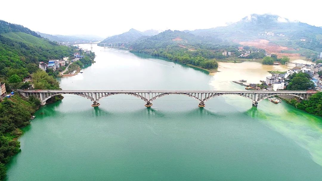 针对这一挑战,项目首创了山区复杂条件下拱桥原位拆除重建技术,采用原址重建方案,在采用主跨180米的中承式钢管混凝土拱桥作为重建方案的基础上,首次提出“旧桥建新拱,新拱拆旧桥”的设计思路,将新拱肋布置于旧桥两侧,施工中先安装新拱肋,然后将旧桥扣挂于新建拱肋之上,逐段切割倒装拆除旧桥。这一方案不仅最大程度减少了接线工程对水源保护区和景区生态环境的影响,还实现了永临结合,体现了绿色、节能、循环、低碳的“生态建桥”理念。