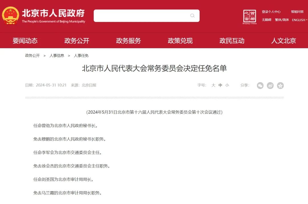 5月31日,北京市人民代表大会常务委员会发布一批任免名单,其中,任命李军会为北京市交通委员会主任。