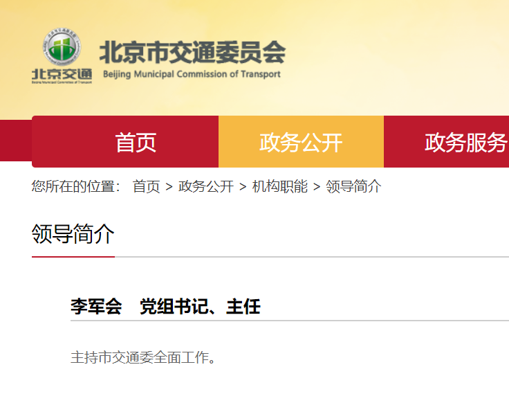 北京市交通委员会官网显示,李军会任党组书记、主任,主持市交通委全面工作。