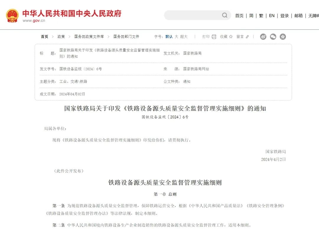 3、《铁路设备源头质量安全监督管理实施细则》施行