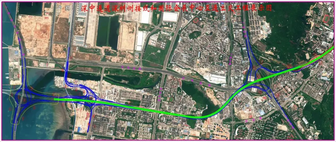 广深沿江高速二期工程位于深圳市宝安区境内,包括深中通道深圳侧接线和国际会展中心互通立交(已于2019年11月3日投入使用)两部分。