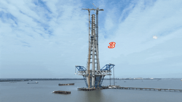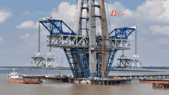 2021年3月9日,大桥北主塔主墩钢沉井封底混凝土浇筑完成,标志着大桥的第一个“世界首创”——台阶型沉井基础顺利完成。
