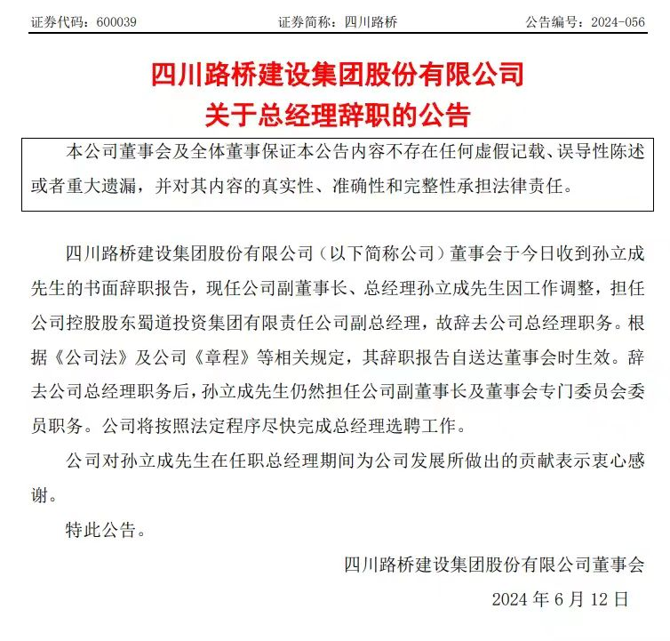6月12日,四川路桥发布公告称,四川路桥副董事长、总经理孙立成,担任蜀道投资集团有限责任公司副总经理。