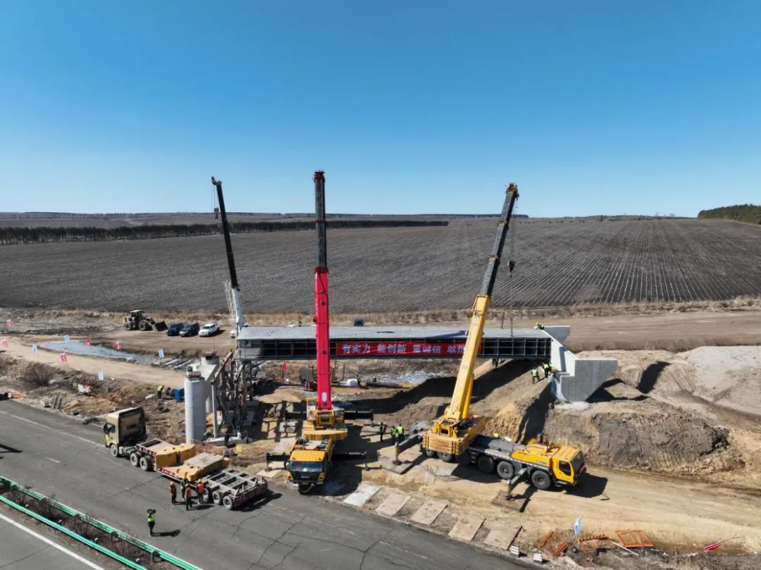 近日,北漠高速五大连池至嫩江段工程建设项目A3标段施工现场一派繁忙。在保障G4512双嫩高速正常通行的条件下,鹤山北互通上跨桥钢箱梁架设任务顺利完成,标志着全线关键性节点控制工程取得实质进展。