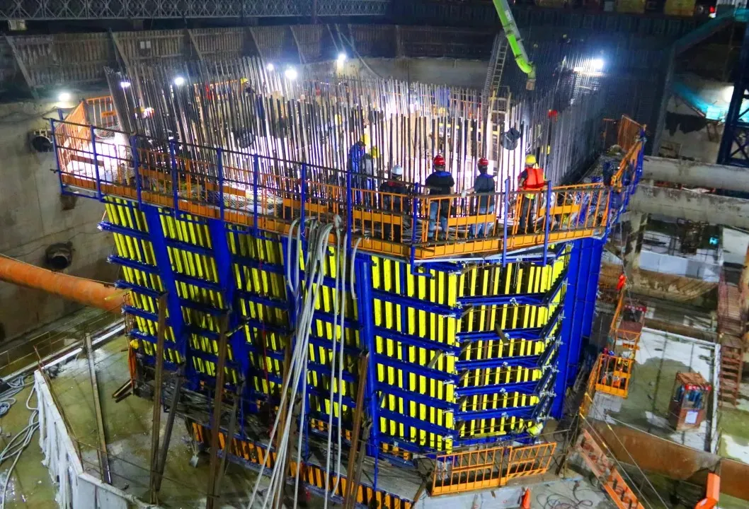 大桥3号主塔为花瓶型混凝土塔,由塔座、下塔柱、中塔柱、上塔柱、下横梁、上横梁6部分组成,主塔总高度153米,两侧塔柱各分27次浇筑成型,单个塔柱混凝土共17440.5立方米。完成塔柱第一节施工后,后续将采用液压爬模施工塔柱剩余节段,各个塔柱面配置独立的液压驱动系统,可分别爬升。爬模系统安装完成后,模板的表面处理、安装就位、调整及固定均可由系统自身完成。计划年内完成塔柱浇筑116米。