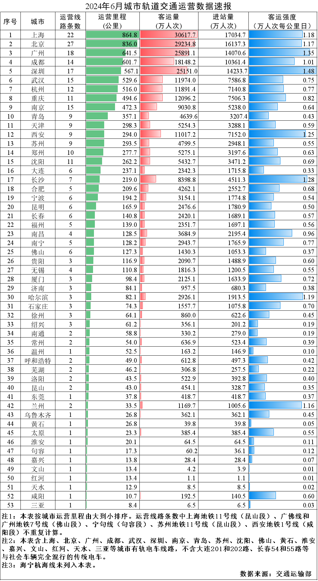 2024年6月,31个省(自治区、直辖市)和新疆生产建设兵团共有54个城市开通运营城市轨道交通线路311条,运营里程10339.4公里,实际开行列车335万列次,完成客运量26.2亿人次,进站量15.7亿人次。6月份,客运量环比减少1.6亿人次,降低5.8%,同比增加1.9亿人次,增长7.6%。6月份全国总运营里程的平均客运强度为0.849万人次每公里日,环比降低2.9%,同比增长1.5%。