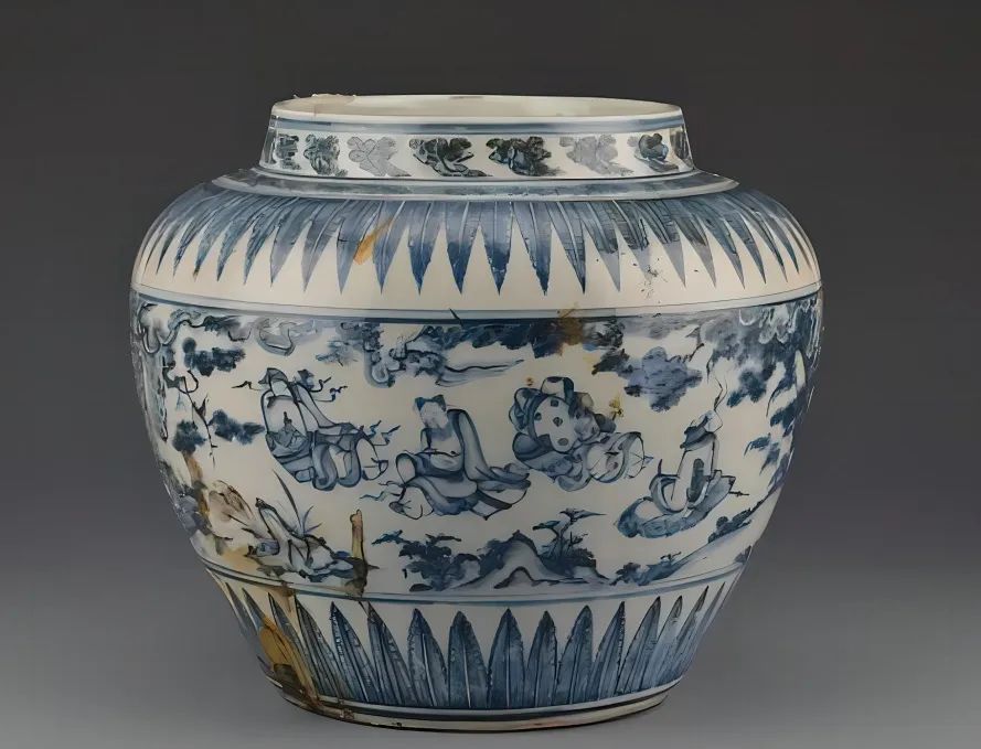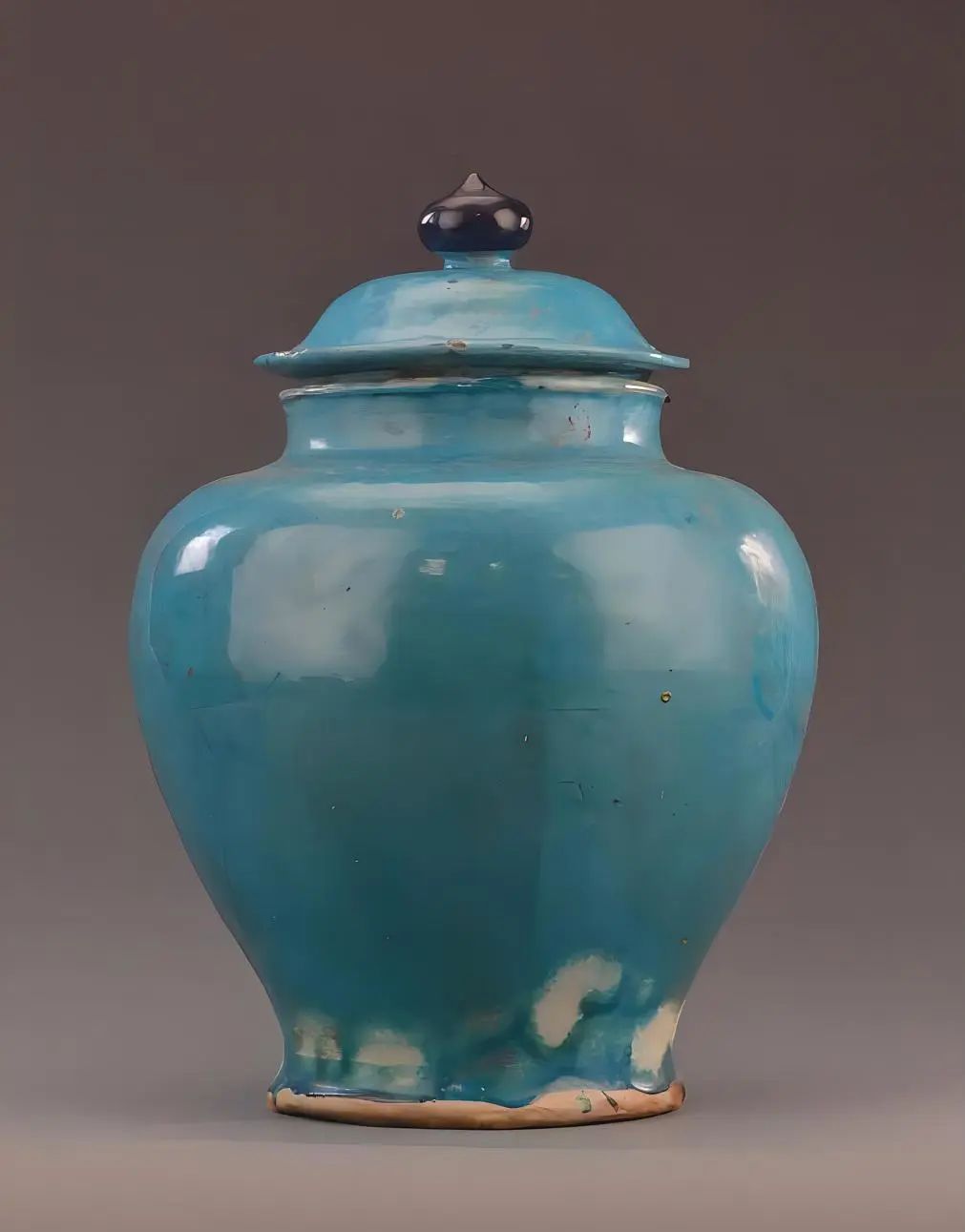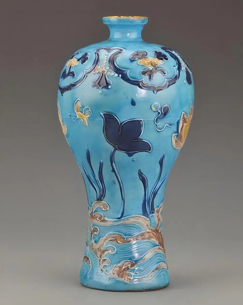 如宝石之流光、似水晶之晶莹、媲美金珀之华丽,只有身份足够尊贵的人,才能配得上珐华彩的艳丽。一号沉船出水的部分珐华器更为珍贵,它们的表面出现了主体纹饰贴以黄金金箔的工艺,可以算是高级定制了。其中一件珐华彩莲纹梅瓶,以孔雀蓝打底,釉色温润如玉。宝石蓝色勾勒出的莲花图案灵动精致,金箔点缀的水纹装饰在瓶身和瓶口,增添华丽气质。整件瓷器最终形成3层极为立体的纹饰,既有工整的图案特色,又有传统的绘画风格,清新又不失雍容。