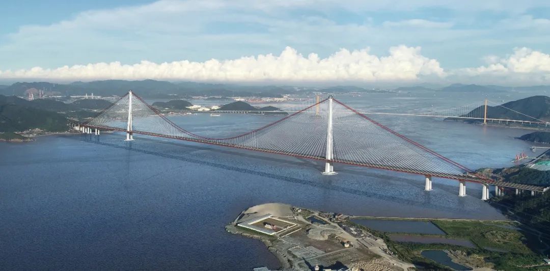 东海之滨,浪潮涌动,世界最大跨度公铁两用大桥——甬舟铁路西堠门公铁两用大桥建设现场一片大干景象。